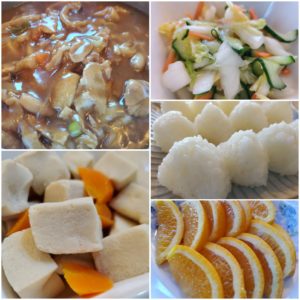 ☆カレーうどん☆おにぎり☆高野豆腐の煮物☆白菜と胡瓜の浅漬け☆オレンジ