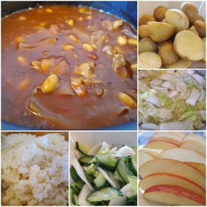 ☆にくまめカレー☆白菜スープ☆胡瓜と蕪のサラダ☆蒸かしじゃが芋☆りんご