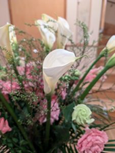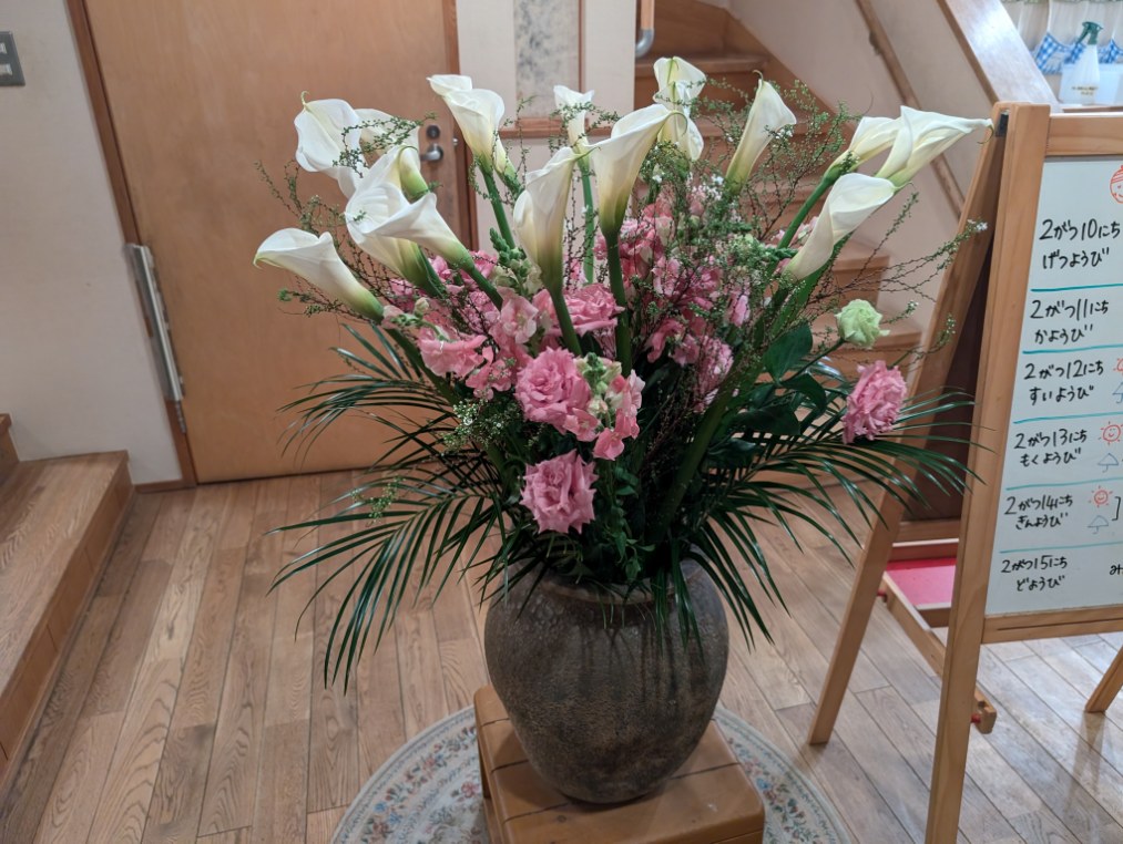 毎週火曜日にお花屋さんからどんぐりの玄関にお花が届きます。(今週は火曜日が祝日なので今日届きました!!)カラーキンギョソウトルコキキョウユキヤナギフェニックスロベニー