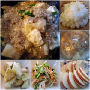 ☆麻婆豆腐丼(白米)☆もずくと玉葱の味噌汁☆蒸かし新じゃが芋☆人参と豆苗の和え物☆りんご