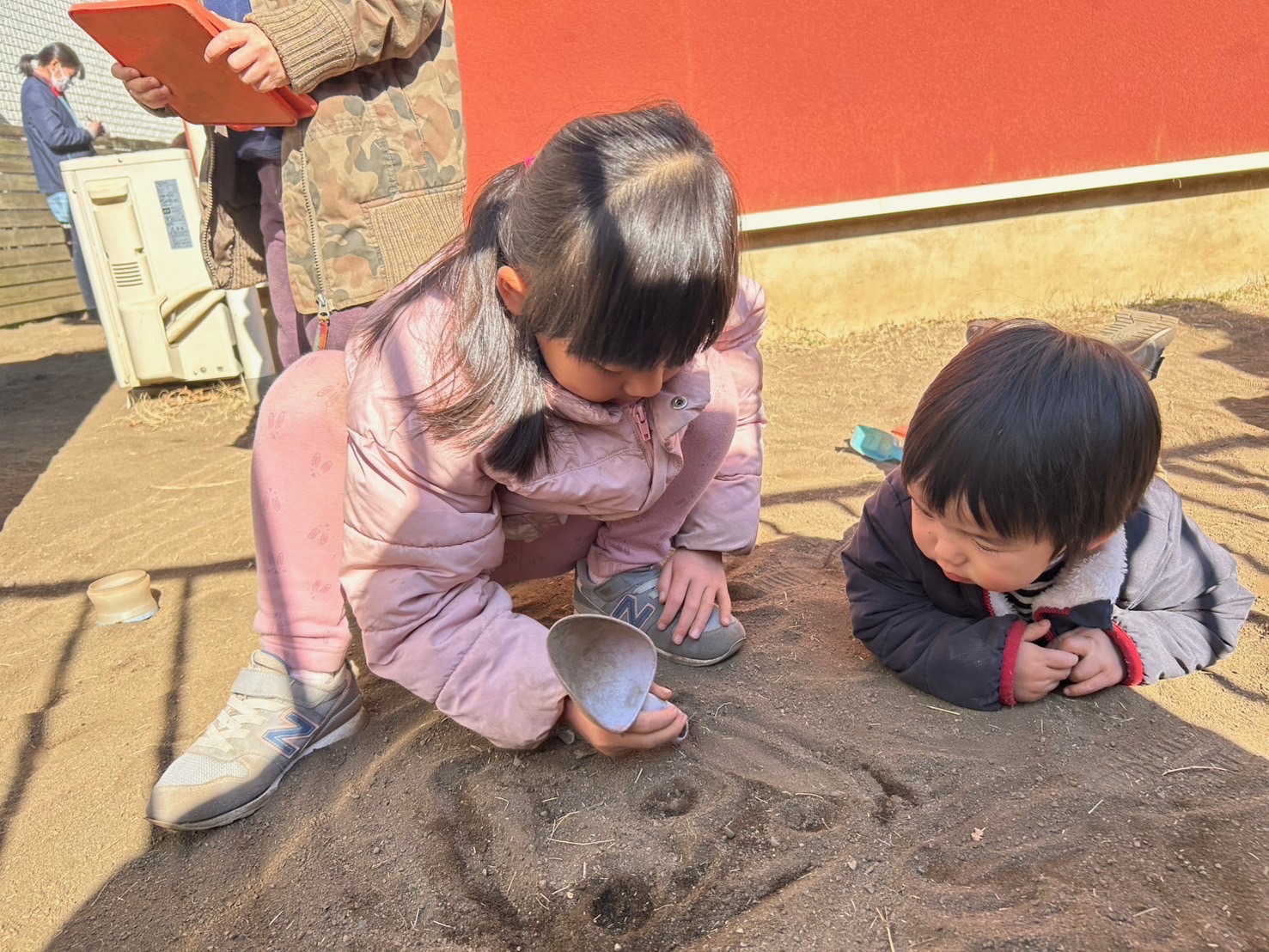 お庭でじっくり遊んだ子ども達。サラサラの砂を気持ち良さそうに手に取ってみたり遊びに使ってみたりして楽しんでいました♪