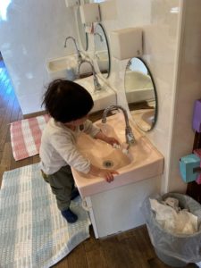 お庭から戻り最後に手洗いを終えた2歳児の男の子。周りに飛び散った水滴をきれいに拭き取っておしまいにしていました✨普段の生活の中で自分から学んで行動している姿に大きな成長を感じました。