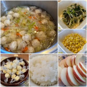 ☆肉団子スープ☆ご飯☆もやしとほうれん草の海苔和え☆子までみんなでソテー☆キャンディーチーズ☆りんご