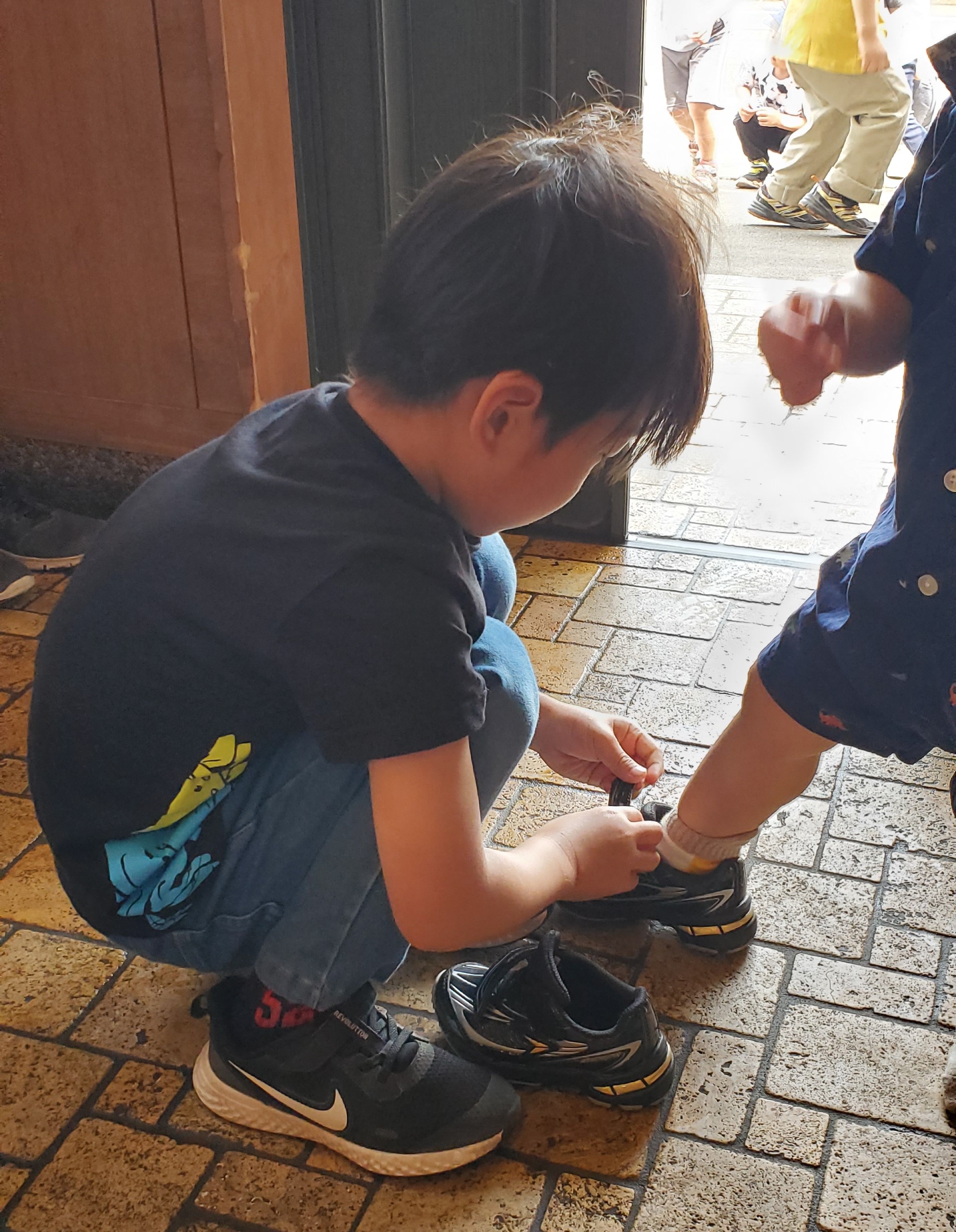 お散歩に出る前の一コマです。準備が終わって外で待ってるお友達を見て、〝僕も行きたい!〟と靴を持ってきて外を見つめる1歳児の男の子がいました。その様子に気が付いた年長のお兄ちゃんが、黙って靴を履くのを手伝ってあげていました。心がほっこりするひと時でした。