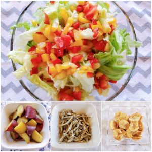 彩りサラダ 蒸かしさつま芋 小魚 バナナチップ