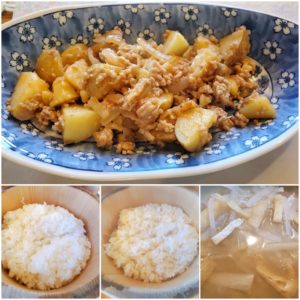 ☆新じゃが芋のジャーマンポテト☆玄米入りご飯☆白米☆大根と油揚げの味噌汁