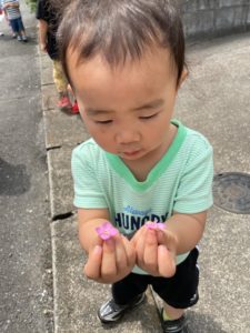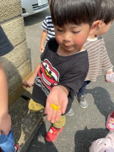 今日は近所をのんびりとお散歩しました。「今日は何探し散歩にしよっか?」と聞くと「かわいい物!」と返事が返ってきました。すると早速「これかわいいよ」と男の子がカタバミの花を摘んで見せてくれました。