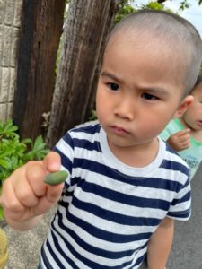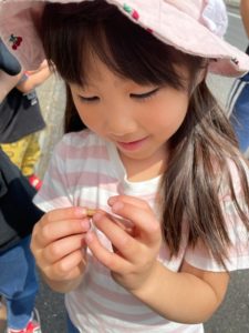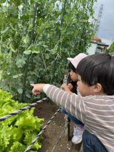 ⇩畑の横を通るとモンシロチョウやテントウ虫、これから大きくなっていく野菜や苺など、発見した物をじーっくりと観察して楽しんでいました。