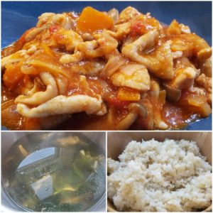 ☆鶏肉のトマト煮☆玄米入りご飯☆えのきとわかめのスープ