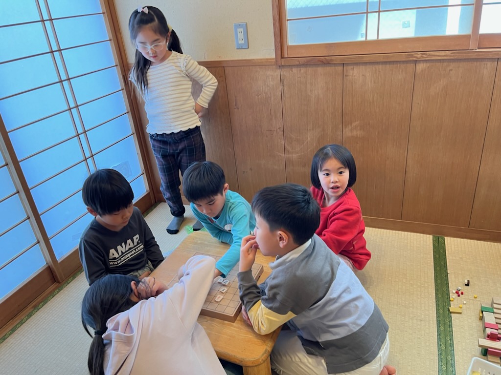 ランチを食べ終えた後、年長さん達は部屋に集まりみんなで将棋を楽しんでいました☖
