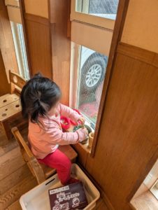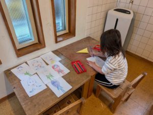 雨も降っていたのでお部屋でのんびりと過ごしました♪絵を描くのが大好きな女の子はアトリエ室で夢中になっていました😊こちらの女の子2人はおりがみで扇子作りを楽しんでいましたよ♪窓の外を見ながらおままごと中です・・・