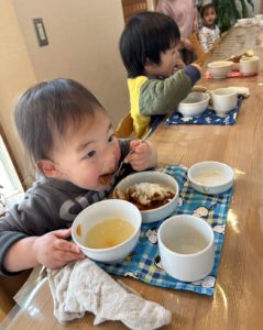ランチはハヤシライス♪ランチルームのカウンターを選んでもりもり食べていた2歳児の男の子達です♪