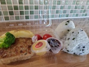 ☆わかめおにぎり☆ハンバーグ☆ブロッコリー☆ミニトマト☆プチゼリー☆バナナ