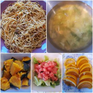 ☆ナポリタンスパゲティー☆春キャベツとコーンのスープ☆蒸かし南瓜☆彩りサラダ☆オレンジ