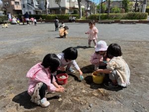 女の子達は砂遊びの道具を使ってごっこ遊びを楽しんでいました。