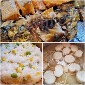 ☆枝豆コーンご飯☆えのきとお麩の澄まし汁☆焼き鮭(鮭、鯖)☆南瓜の煮物