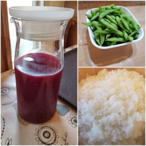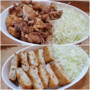 ☆コロッケ&から揚げ☆千切キャベツ☆枝豆☆白米(ふりかけ)☆野菜ジュース