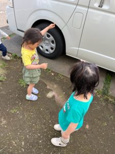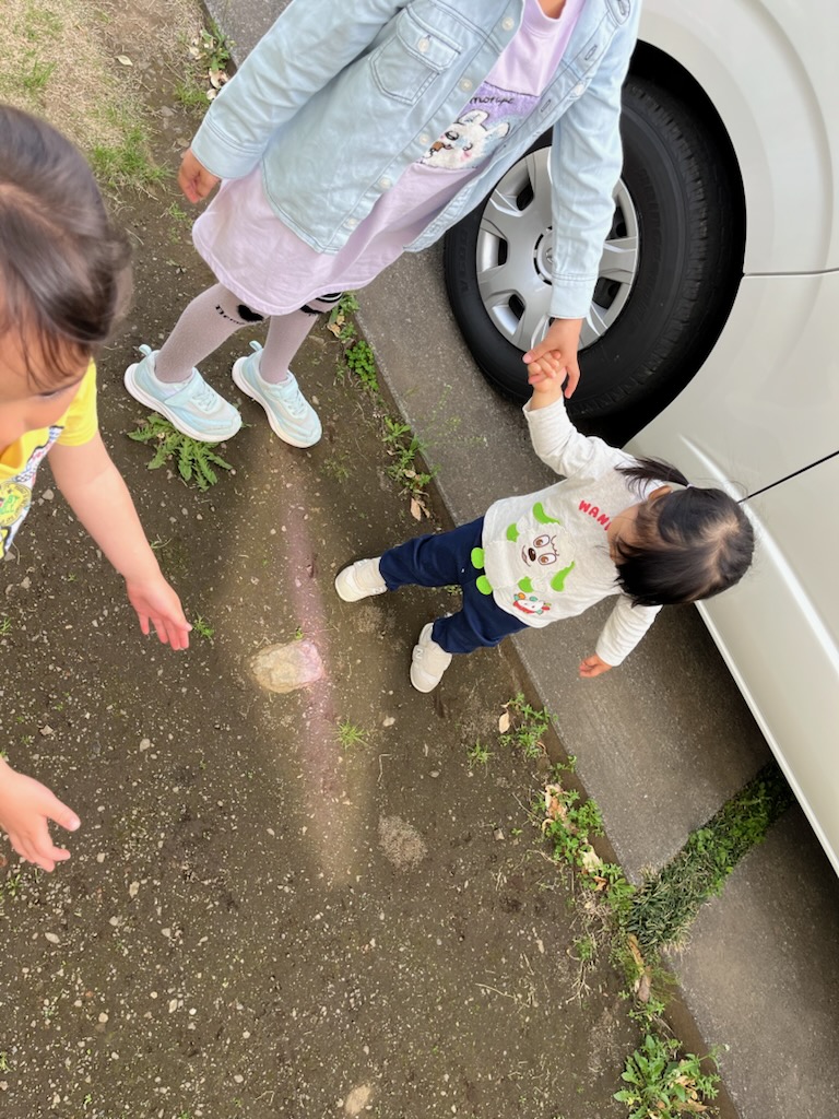 お庭に出る途中に光の影がうつしだされてるのに気づいた子ども達
