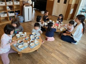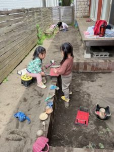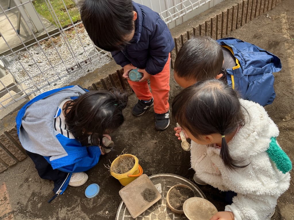 砂場にズラリと並べてごっこ遊びを楽しんでいました♪