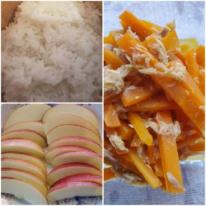 ☆千切りキャベツ+トマト☆新人参のしりしり☆りんご