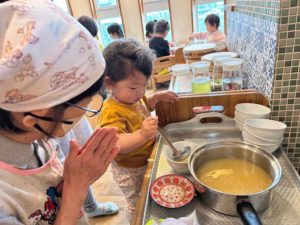 この後、よそったお味噌汁も自分で自分の席に運んでいました。