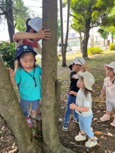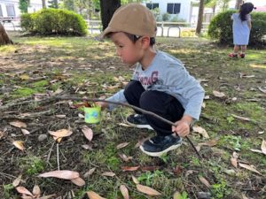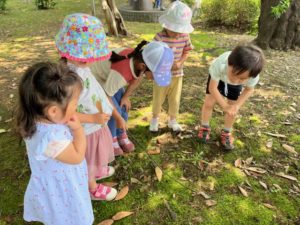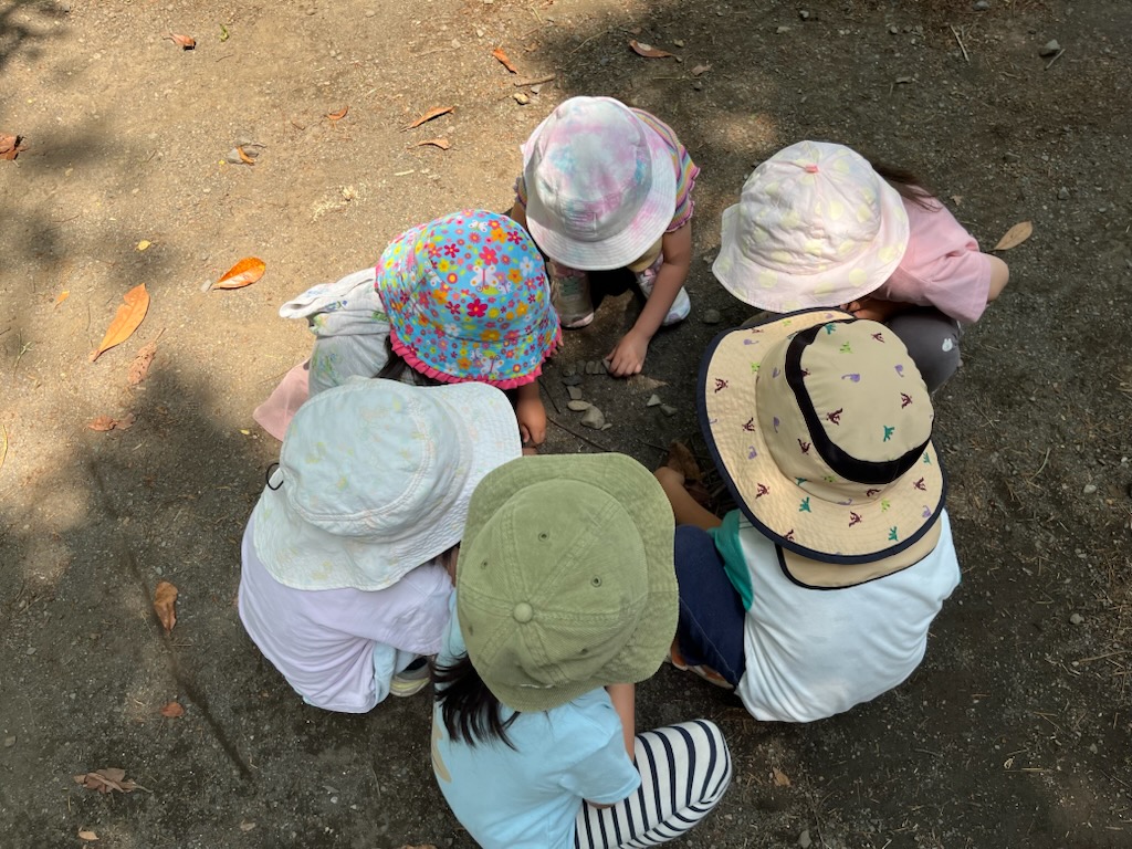 「むし~!」と、小さなてんとう虫の幼虫を発見!じーっと動かない幼虫をじーっと動かず見守る子ども達でした🐞