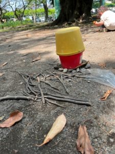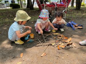 小枝を拾い集めながら目的の場所に到着すると、早速たき火ごっこを始めた大きい子達。