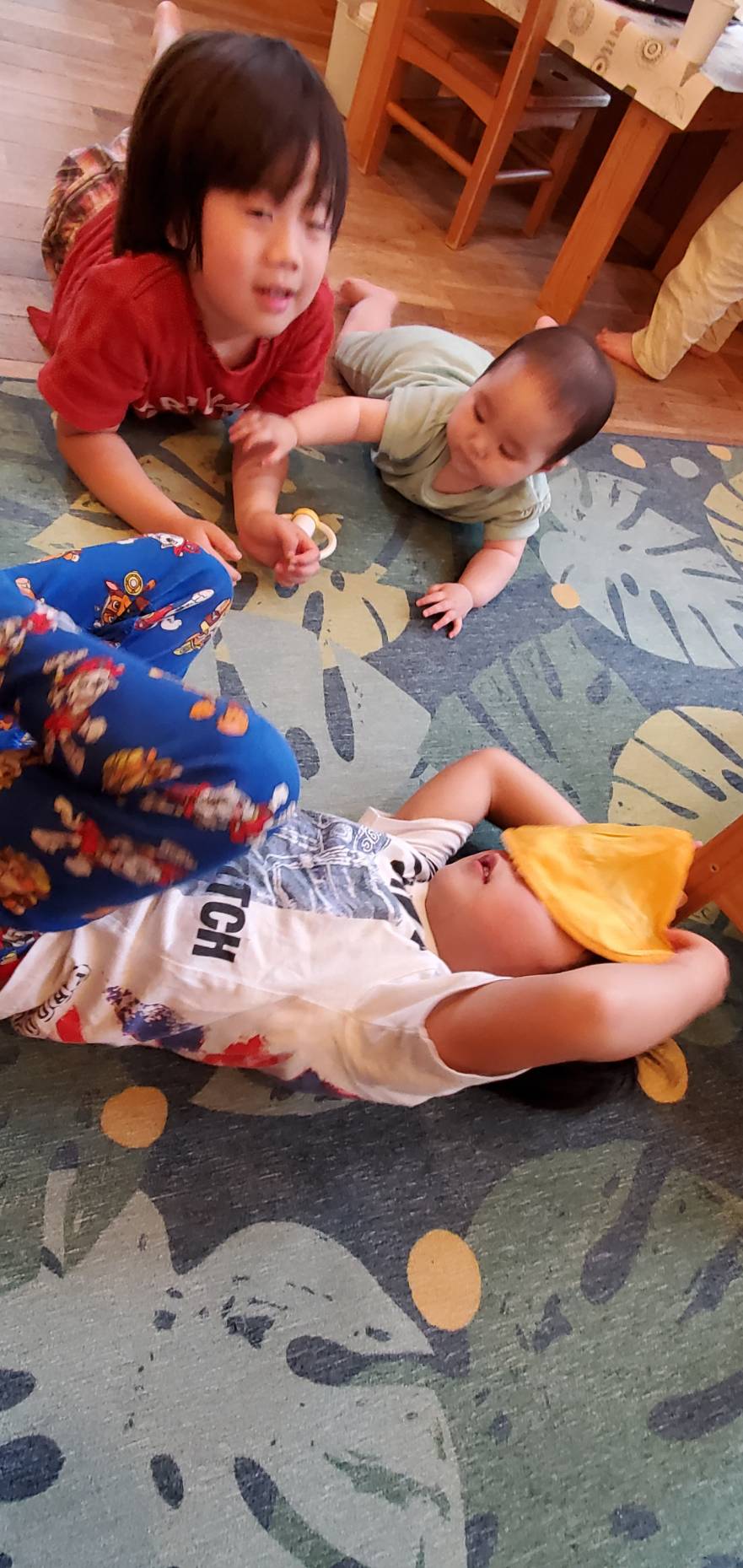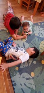 写真には0歳児、3歳児、4歳児の子が写っています。0歳児の子が遊んでいる様子を見て、お兄ちゃんたちがそっと見守ってくれていました。優しく接してくれて0歳児の子も嬉しそうでほっこり😊