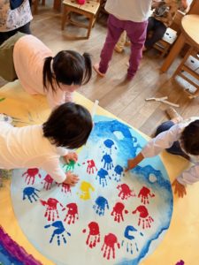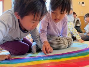 地球と虹をモチーフにした壁画をみんなでつくりました。