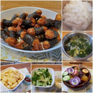 ☆白米☆のり巻きチキン☆ポテトフライ☆ワカメと玉ねぎコーンのスープ