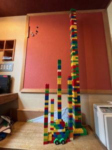 車にブロックを高く積み上げて走らせていました。高く積み上げる面白さは