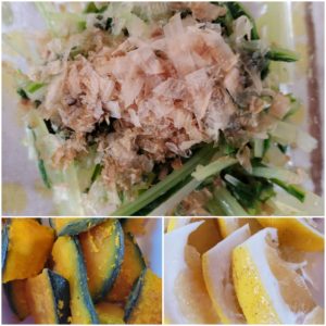 ☆水菜とおかかサラダ☆焼きかぼちゃ☆ばんかん(果物)