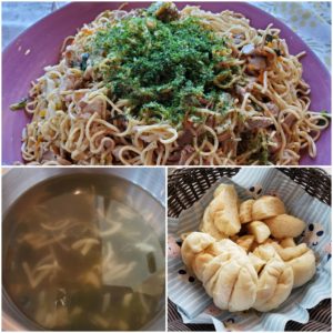 ☆焼きそば☆わかめと玉葱の中華スープ☆白パン