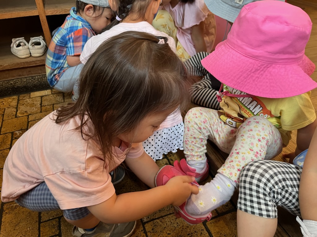 この場面は同じ1歳児同士のやり取りです。先に靴を履いて準備を済ませた男の子が靴を履きたそうにしていた女の子に気付き上手にお手伝いをしてくれました。女の子の方もその優しさを受け入れ黙ってその姿を見つめていました。相手を思う気持ちが育っています…🍀