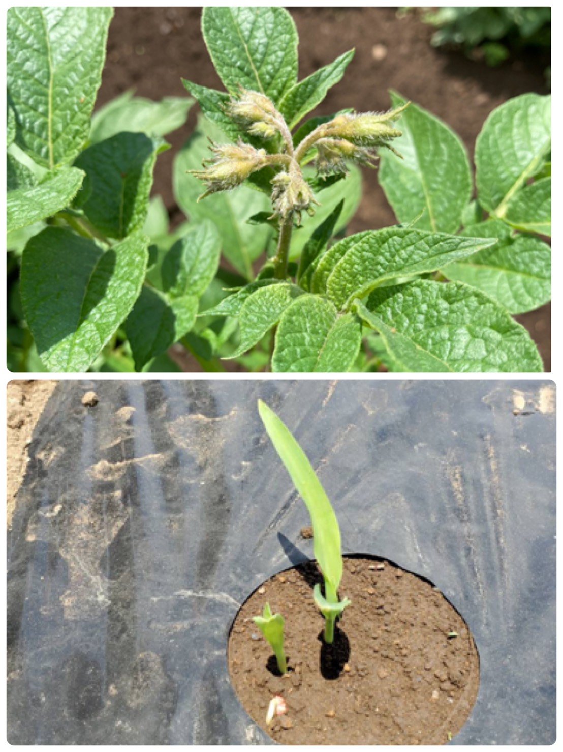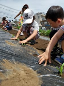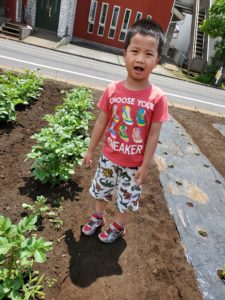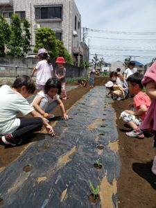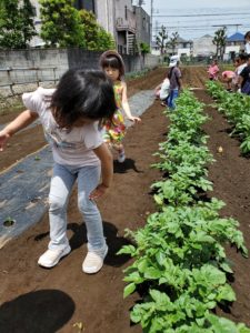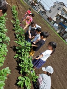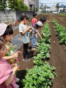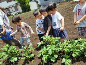 先週は雨の日が多く、なかなか畑の様子を見に行くことが出来ませんでした。今日は晴れたので、お散歩帰りに畑に寄って来ました。じゃが芋の様子を見るや否や、年長の女児が「あっ。つぼみが出来てるー!」とすぐに気が付きました。周りの子ども達も「わっ、本当だー!こっちにもあるよ!」と、見てまわっていました。