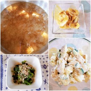 もずくと豆腐の味噌汁/ほうれん草のおかか和え/新じゃが芋ときゅうりのサラダ/バナナチップ