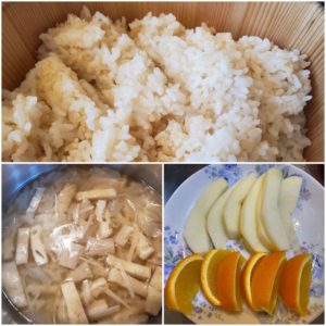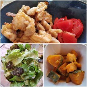 ☆鶏のからあげ☆レタスのりサラダ☆南瓜煮☆玄米入りご飯