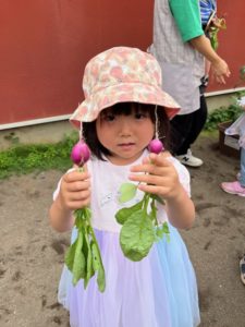 色や匂いをかいでみたり、さて採れたラディッシュどうしようかな~?