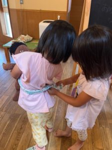 お友だちがお人形を抱っこしたい事に気づいて後ろを結んでくれていました。