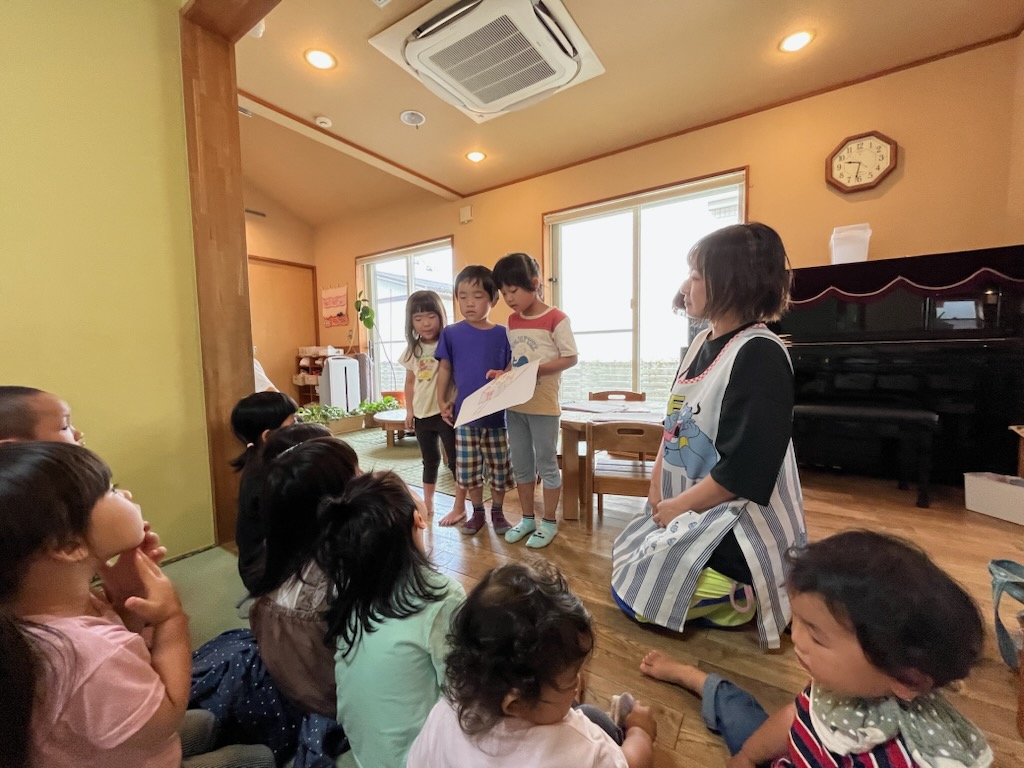 朝の集いでは七夕についての話しと年長さんからはお神輿つくりをする発表がありました。