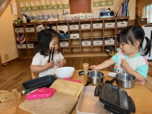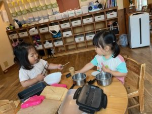 ☆ままごとコーナーでは1歳児と3歳児のお友達が「かーしーて」「いーいーよ」のやり取りをしながら仲良く遊んでいました