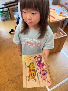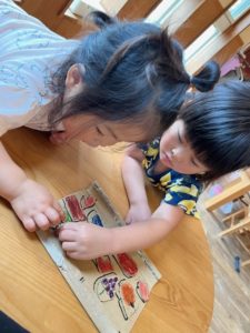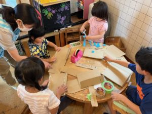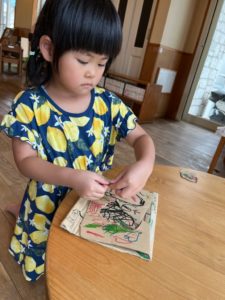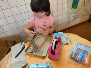 「パズルを新しいものと交換したい」と意見がでましたが、あいにく他のパズルがピース不足で出せず…「じゃあ自分達で作ってみる?」「作ってみるー!」と、いう事でオリジナルパズル作りが始まりました♪