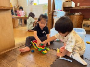 ☆ブロックコーナーでは男の子達が新幹線を作り、折り紙で作った貨物列車と一緒に走らせていました~🚅
