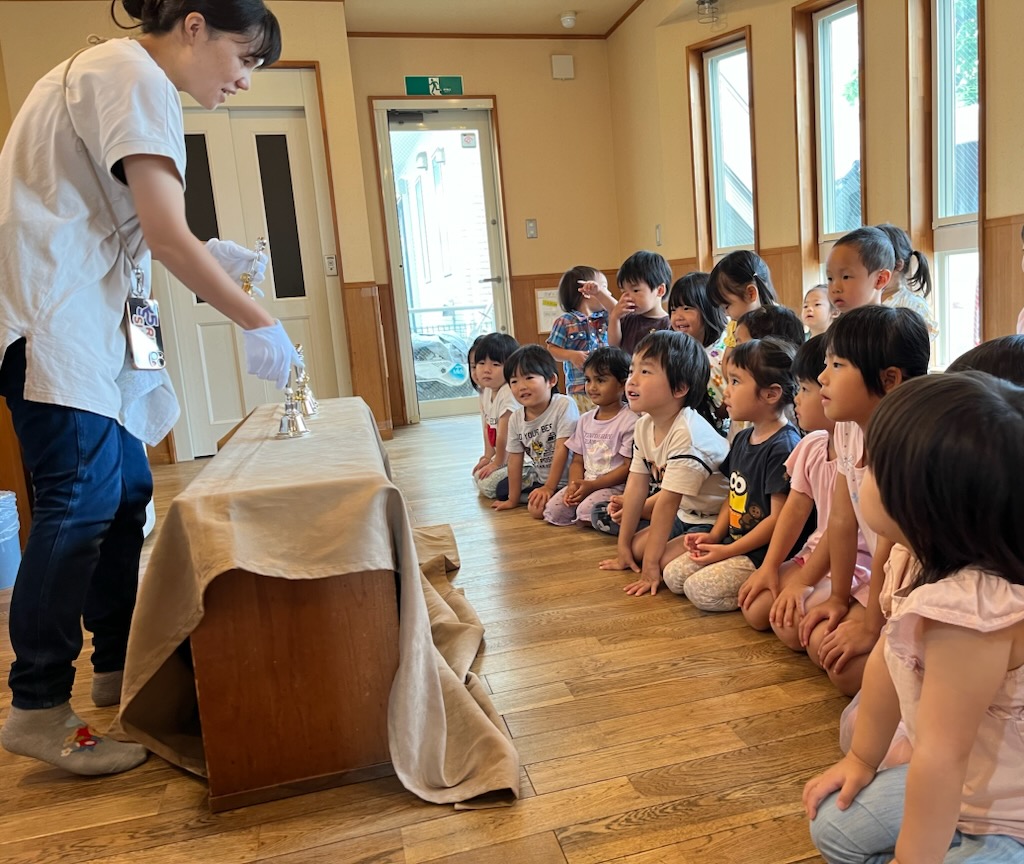 きれいな音色にみんな釘づけです♪演奏が終わると拍手喝采でした👏 ハンドベルで演奏したりいろんな歌を歌ってみんなで楽しも~(^^♪