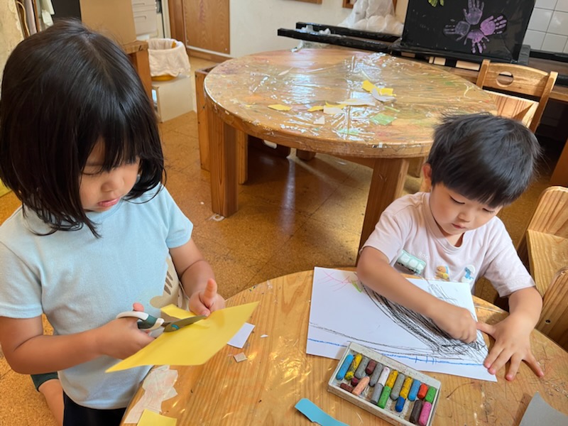 朝からアトリエ室で描画や工作に向かう子ども達