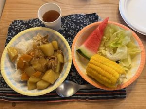 ☆カレーライス☆レタスのりサラダ☆茹でとうもろこし☆スイカ