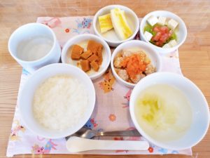 5倍粥 春キャベツと新玉葱のスープ 肉団子のトマト煮 蒸かし南瓜 野菜たっぷり豆腐サラダ バナナ