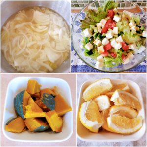 春キャベツと新玉葱のスープ 野菜たっぷり豆腐サラダ 蒸かし南瓜 グレープフルーツ