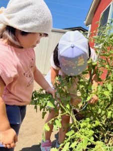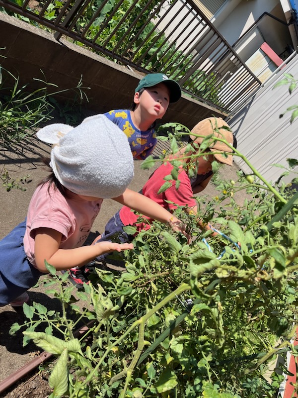 庭の奥で大きい子達が育てているミニトマト。どんどん茎が伸びていくので重さで倒れてしまいそう!そう朝の集いで伝えると「じゃあ見に行かなきゃ!」という事でミニトマトを助けに行くことに。