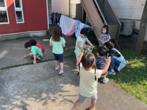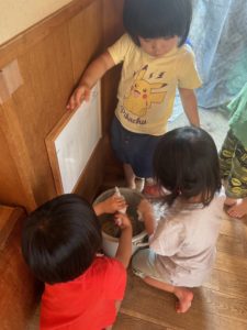 お友だちとカップなどを使って水の変化を面白がっていました。